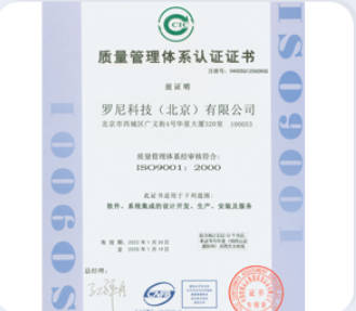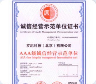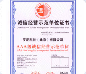 罗尼科技,10年风雨兼程,秉承客户至上,以服务客户为中心的原则,受到客户高度评价。罗尼科技2016年通过ISO90001国际体系认证、2019年被评定为企业信用等级三A级、质量服务信誉单位、诚信经营示范性单位、2023年通过北京市建筑业企业资质评定、2025年信息系统集成服务企业一级资质证书评定、成为中国招投标领域入库供应商。